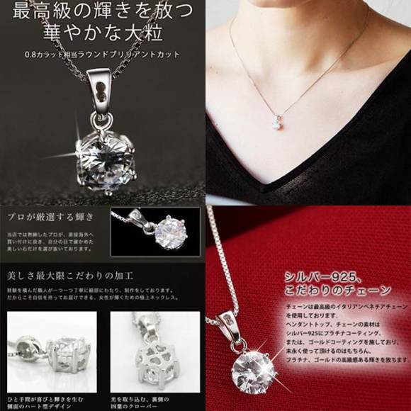 | 内容 | ・石:CZ(キュービックジルコニア) 【0.8カラット相当(直径約6mm)】 ・:シルバー925 プラチナコーティング ・【チェーン長さ:約40cm】 |