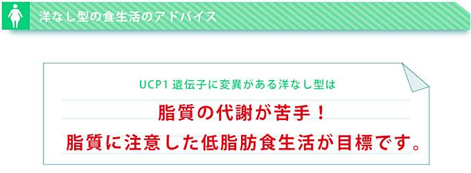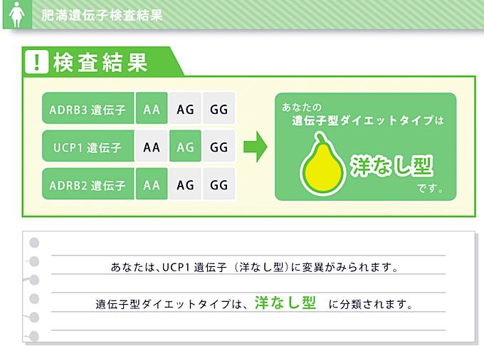 GeneLife DIET 肥満遺伝子検査キットの結果は、UCP1遺伝子に変異があり、遺伝子型ダイエットタイプは洋なし型となりました。