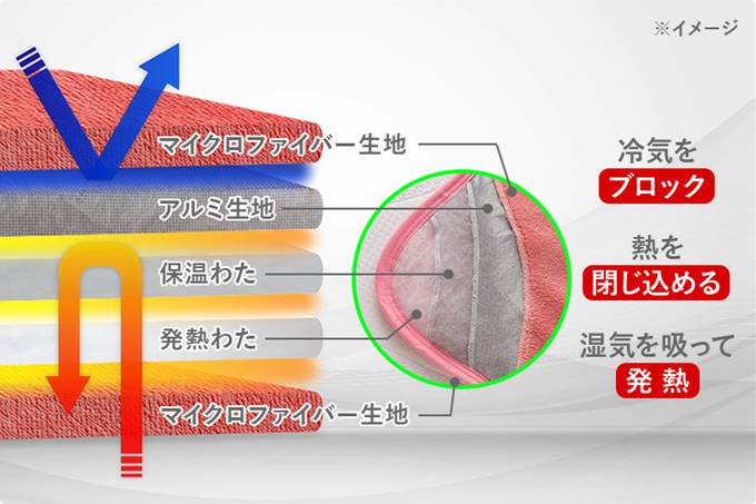 「冷気をブロック」「熱を閉じ込める」「湿気を吸って発熱」という仕組みになっていて、これらの生地を肌触りの良いマイクロファイバー生地で挟んでいます。