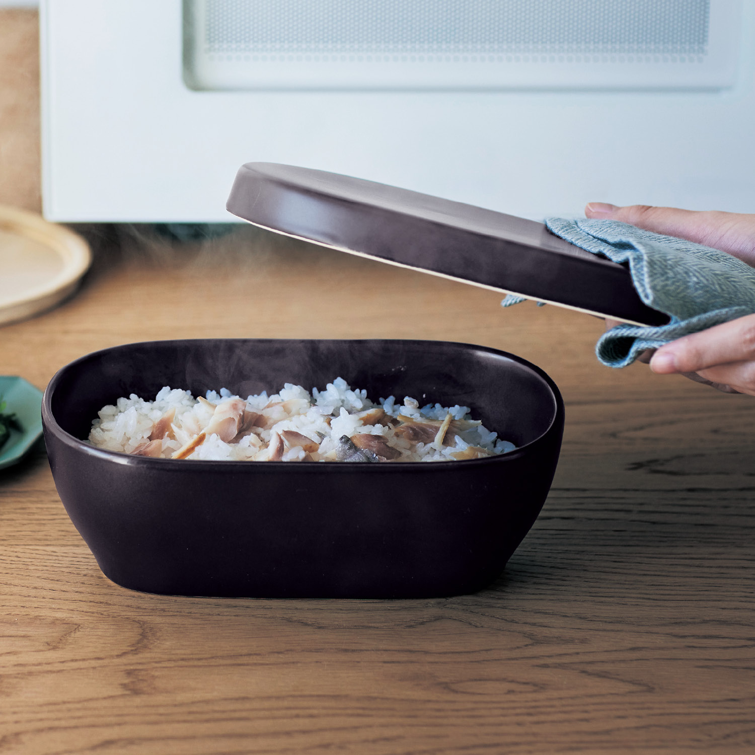 ごはんが冷める過程で出る水分を陶器の多孔質が吸収してキープするので、電子レンジで温め直せば陶器が吸った水分がごはんに戻ってふっくらに!