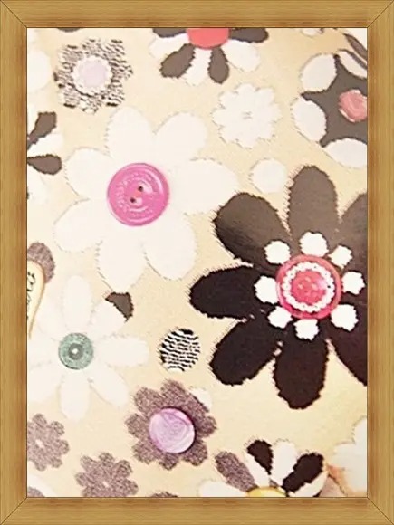 カラフルなオリジナルボタンにスワロフスキーをデコレーションしたポップでどこか懐かしさを感じるような花柄のデザイン。