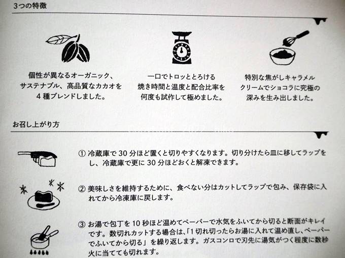 | 原材料 | 有機チョコレート(フランス製造)、発酵バター、全卵、グラニュー糖、 生クリーム/乳化剤(ヒマワリ由来)、香料、 (一部に卵・乳成分を含む) |