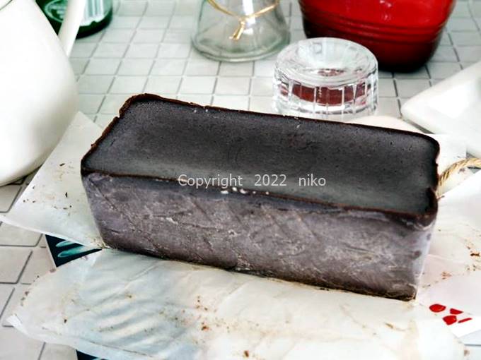 箱を開けると、12.5㎝の長方形の冷凍ガトーショコラがパラフィン紙のような紙に包まれて入っています。